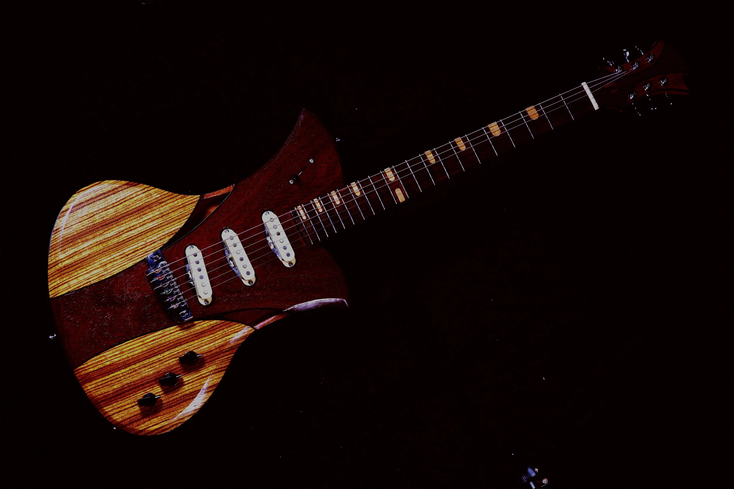 An electric guitar with a mixed wood body and a unique shape, with three single-coil pickups and three control knobs.