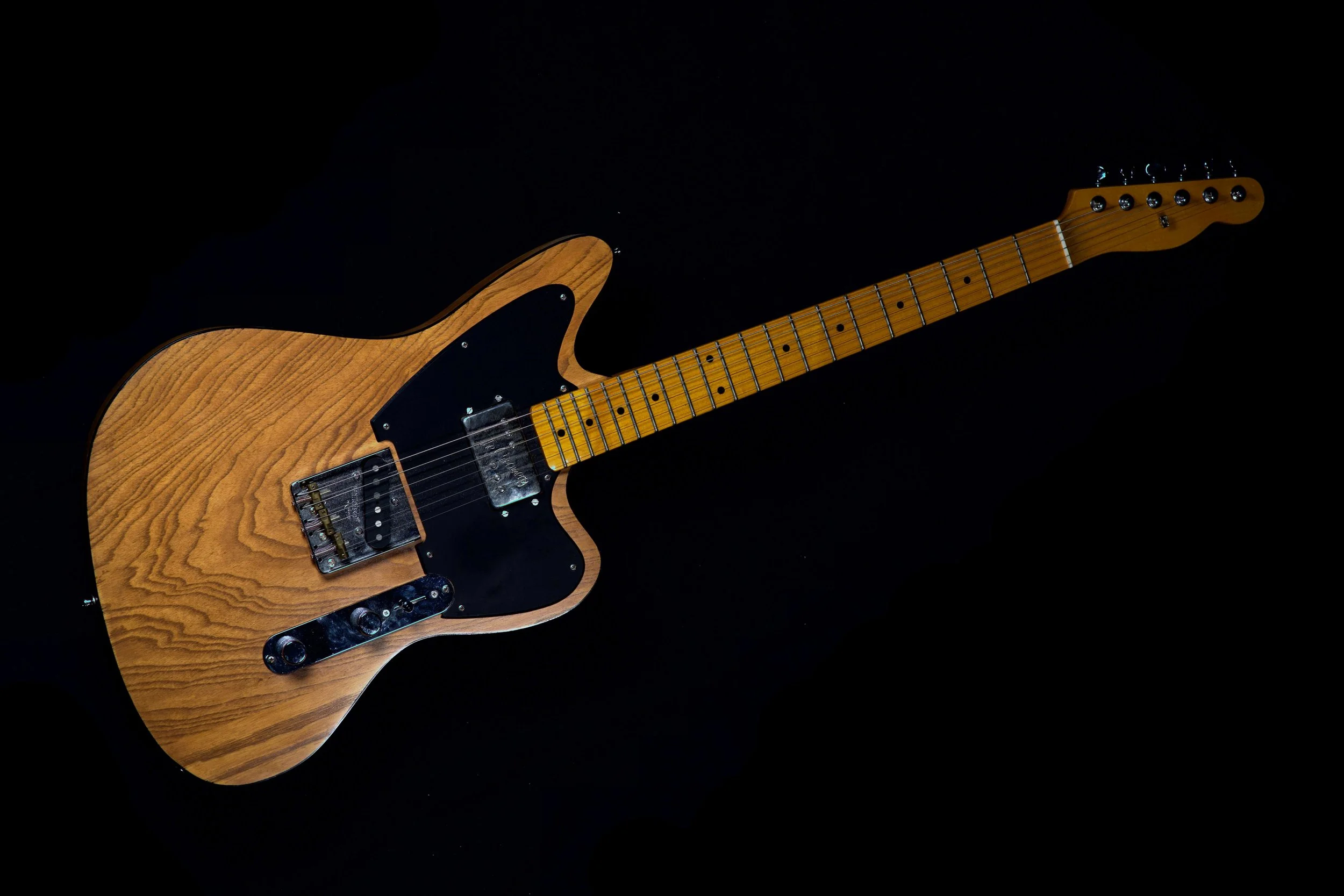 A wooden electric guitar with a black pickguard and control panel, set against a black background.