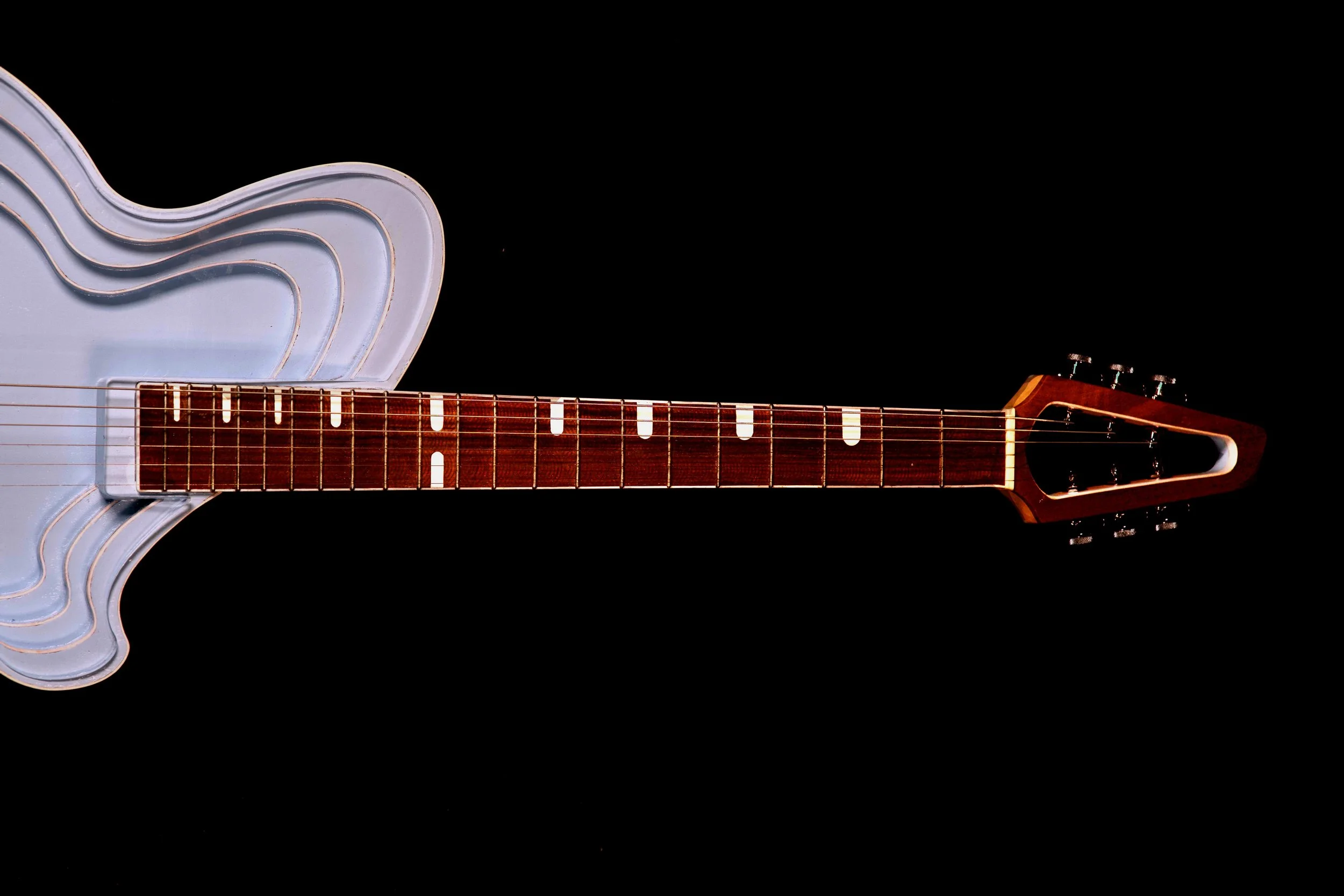 A unique electric guitar with a light blue, layered, wavy design on the body, a wooden neck with white fret markers, and a black headstock with tuning pegs, set against a black background.